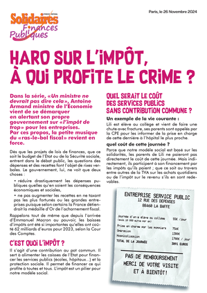 Pour Solidaires Finances Publiques, le système fiscal, sous la pression des politiques libérales, dérive dangereusement. La progressivité laisse de plus en plus la place à la proportionnalité, la fiscalité indirecte prend le pas sur la fiscalité directe, rendant le système de moins en moins juste et favorise les plus riches particuliers et entreprises.