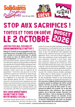 Depuis le 15 juillet et les propositions de François Bayrou pour le budget 2026, la justice fiscale, sociale et environnementale n’a jamais été autant au cœur du débat public et nous nous en félicitons. Comment cela pourrait-il en être autrement quand, rapports après rapports, tout démontre que les plus grandes entreprises sont gavées de milliards d’aides publiques (exonérations de cotisations, niches fiscales et subventions directes) et que les plus fortunés sont imposés moitié moins que la majorité de la population ? Comment cela pourrait-il en être autrement quand une minorité ne cesse d’augmenter son patrimoine et son capital alors que les inégalités et la pauvreté n’ont jamais été aussi élevées depuis 30 ans ? Comment cela pourrait-il en être autrement quand les services publics, les fonctionnaires, les minimas sociaux, la Sécurité sociale, l’indemnisation chômage, les retraites, les salaires sont menacés d’être, une nouvelle fois, sacrifiés sur l’autel de l’austérité ?