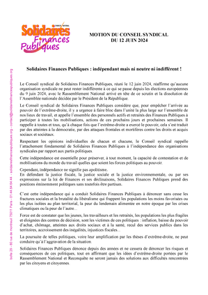 12 juin - Motion du conseil syndicalSolidaires Finances Publiques : indépendant mais ni neutre ni indifférent ! |