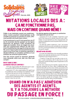 Cela fait donc beaucoup de monde à ne pas penser du bien des mutations au choix. Mais l’indéfectible attachement de la DG au choix et au mérite, poussant à une concurrence forcenée entre les agents est plus fort que tout. En conséquence, la direction générale reste persuadée qu’avec davantage de pédagogie, d’accompagnement, de formations (dont une e-formation d’1h30 afin de corriger en un temps record les biais des recruteurs !) et autres guides et consignes, elle finira bien par acculturer tous les rétifs à sa philosophie…